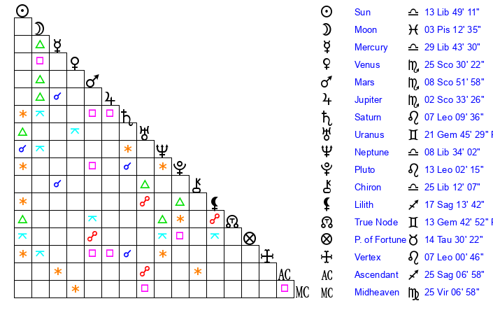 | Sun | 13 Libra 49 | 14 Libra 41 | 3 Capricorn 19 |