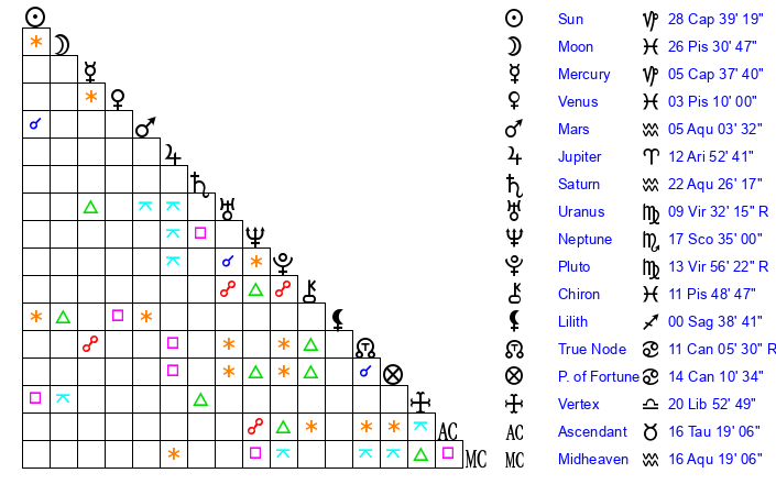 | Saturn | 22 Aquarius 40 | 16 Pisces 5 | 29 Aquarius 50 |