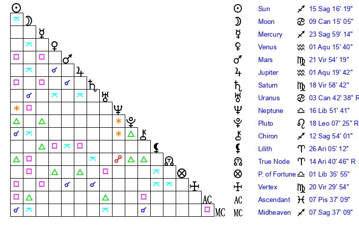 | Neptune | 16 Libra 51 | 29 Pisces 22 | 17 Libra 2 |