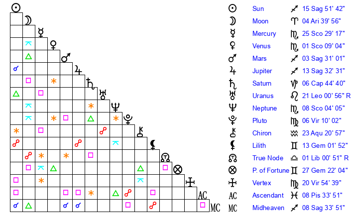 | Sun | 15 Sagittarius 51 | 16 Sagittarius 51 | 22 Aquarius 59 |