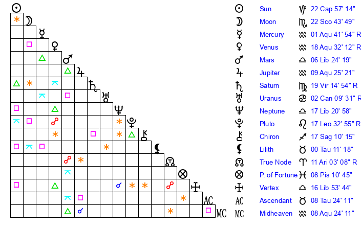 | Moon | 22 Scorpio 49 | 20 Cancer 55 | 12 Leo 40 |