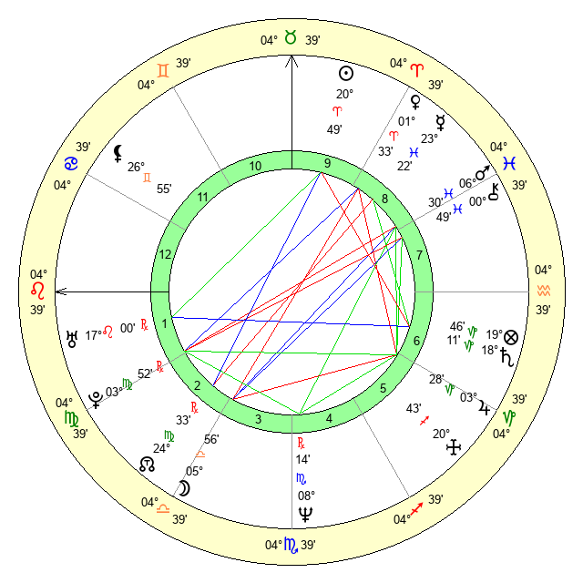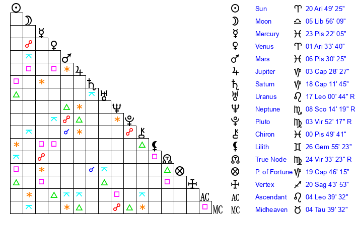 | Moon | 5 Libra 58 | 25 Virgo 48 | 5 Pisces 2 |