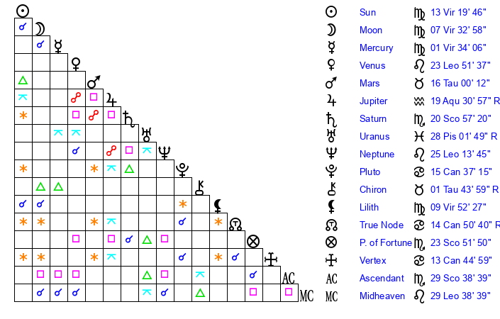 | Sun | 13 Virgo 20 | 14 Virgo 21 | 21 Sagittarius 58 |