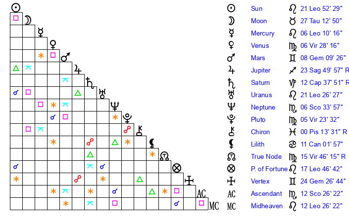 | Sun | 21 Leo 53 | 22 Leo 9 | 25 Libra 19 |