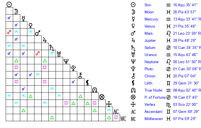 Sun | 16 Aquarius 35 | 18 Aquarius 9 | 4 Gemini 7 |