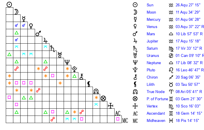 | Sun | 26 Aquarius 27 | 27 Aquarius 16 | 10 Taurus 44 |
