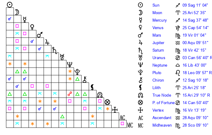 | Moon | 25 Aries 55 | 23 Aries 53 | 11 Aquarius 30 |