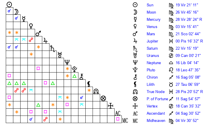 | Moon | 26 Virgo 44 | 27 Taurus 2 | 26 Gemini 27 |