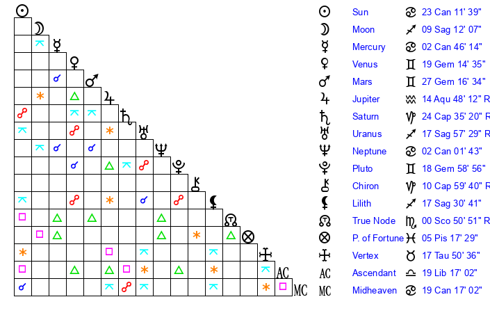 | Pluto | 19 Gemini 0 | 2 Aquarius 46 | 19 Gemini 9 |