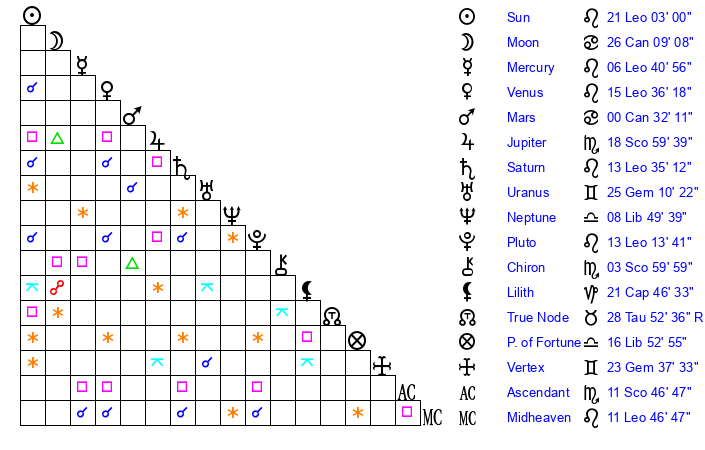 | Sun | 21 Leo 3 | 22 Leo 9 | 7 Scorpio 26 |