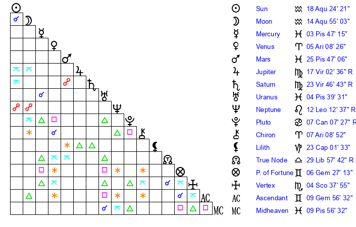 | Sun | 18 Aquarius 24 | 19 Aquarius 10 | 1 Gemini 2 |