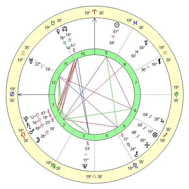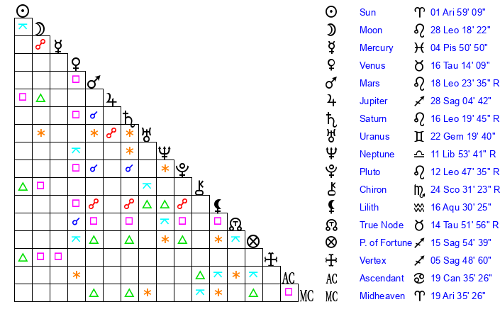 | Sun | 1 Aries 59 | 2 Aries 19 | 16 Gemini 49 |