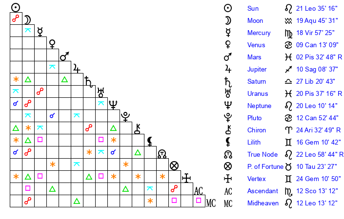 | Neptune | 20 Leo 10 | 1 Aries 44 | 22 Leo 35 |