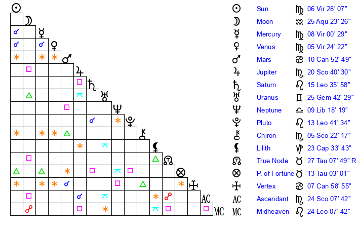 | Sun | 6 Virgo 28 | 7 Virgo 34 | 23 Scorpio 30 |