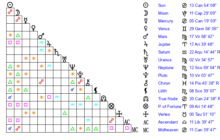 | Neptune | 12 Scorpio 58 | 2 Aries 10 | 13 Scorpio 22 |