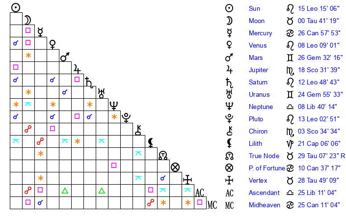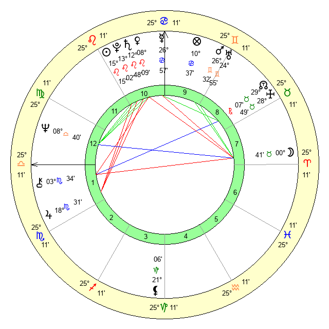 | Mercury | 26 Cancer 58 | 4 Leo 37 | 21 Scorpio 27 |