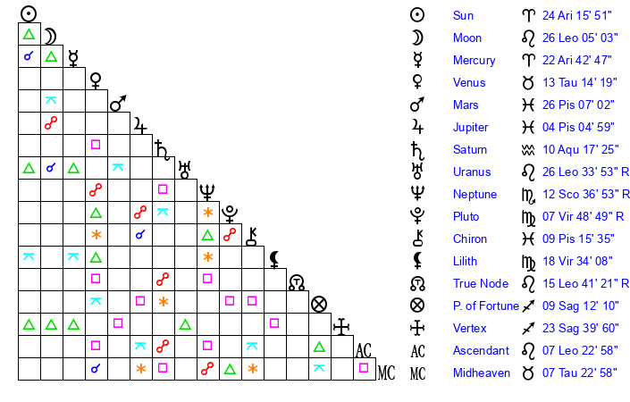 | Sun | 24 Aries 16 | 25 Aries 0 | 25 Gemini 3 |