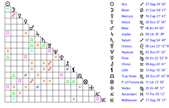 Sun | 27 Sagittarius 34 | 28 Sagittarius 5 | 6 Pisces 37 |