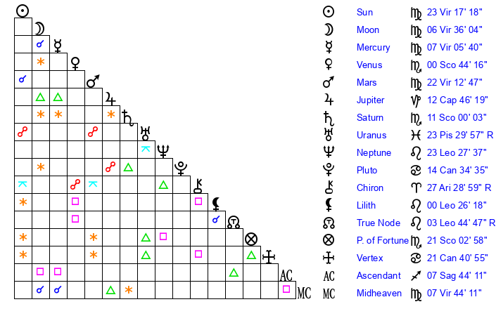 | Sun | 23 Virgo 18 | 24 Virgo 5 | 3 Capricorn 25 |