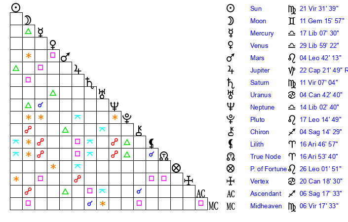 | Saturn | 11 Virgo 34 | 28 Pisces 53 | 19 Virgo 5 |