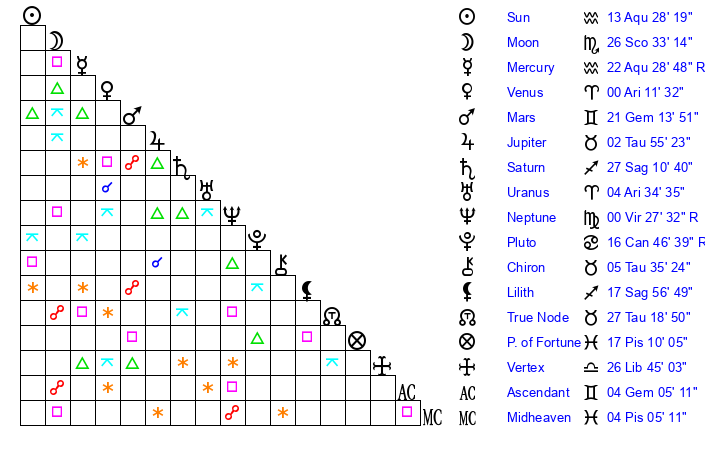 | Moon | 26 Scorpio 31 | 10 Aries 33 | 26 Taurus 4 |