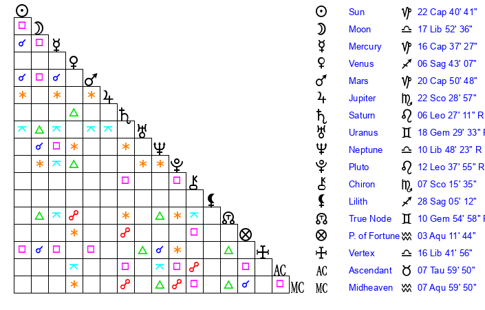 | Neptune | 10 Libra 48 | 27 Pisces 30 | 9 Libra 23 |
