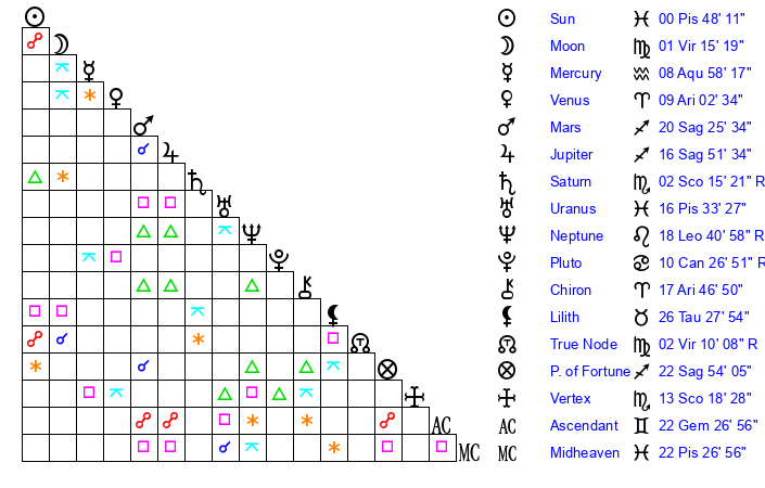 | Sun | 0 Pisces 48 | 2 Pisces 18 | 9 Gemini 56 |