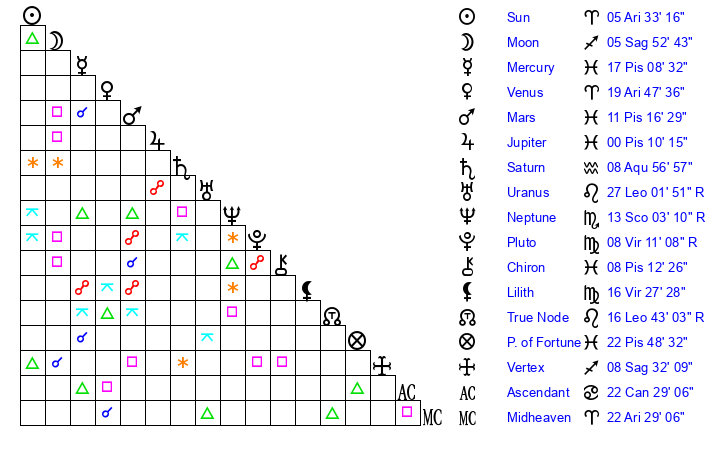 | Moon | 5 Sagittarius 50 | 28 Aquarius 29 | 2 Aries 15 |