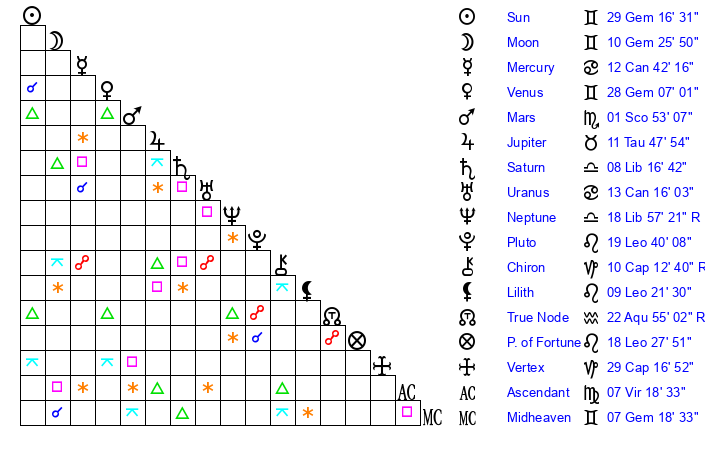 Sun | 29 Gemini 16 | 29 Gemini 37 | 9 Virgo 10 |