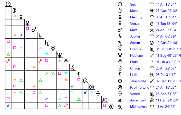 Sun | 14 Aries 15 | 15 Aries 8 | 2 Gemini 51 |