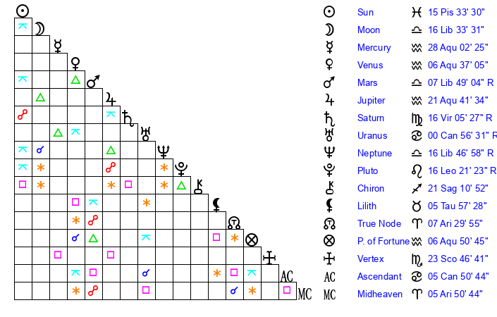 | Neptune | 16 Libra 46 | 29 Pisces 6 | 14 Libra 54 |