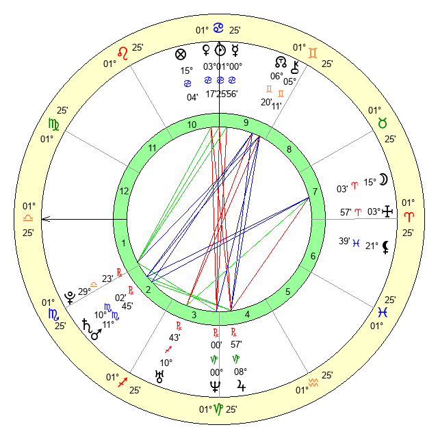 | Sun | 1 Cancer 26 | 1 Cancer 31 | 10 Leo 34 |