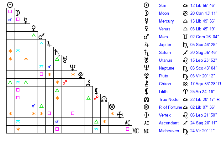 | Sun | 12 Libra 56 | 13 Libra 41 | 20 Sagittarius 10 |