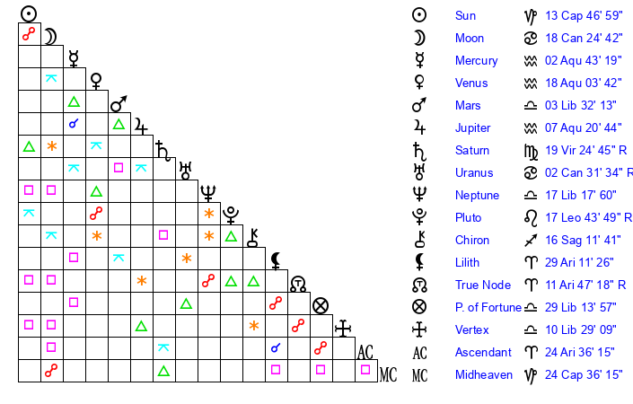 | Moon | 18 Cancer 24 | 14 Pisces 47 | 22 Aries 12 |