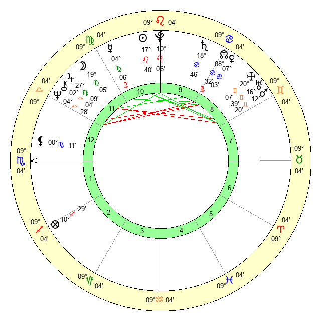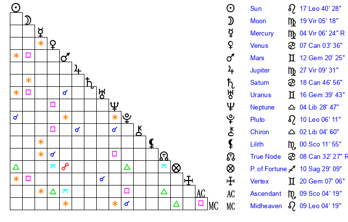 | Moon | 19 Virgo 7 | 5 Pisces 50 | 26 Leo 45 |
