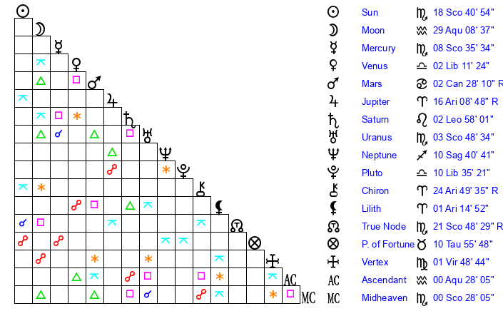 | Sun | 18 Scorpio 40 | 19 Scorpio 33 | 9 Capricorn 23 |