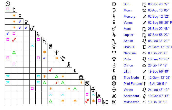 | Sun | 8 Scorpio 40 | 9 Scorpio 31 | 28 Capricorn 47 |