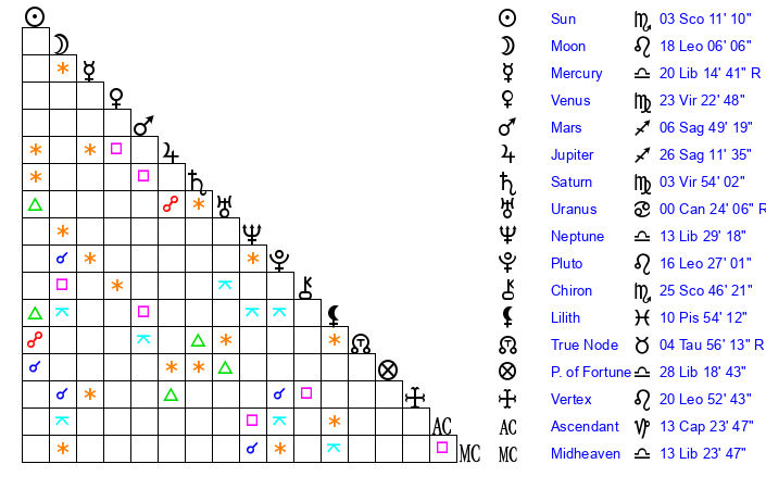 | Neptune | 13 Libra 29 | 29 Pisces 53 | 15 Libra 10 |