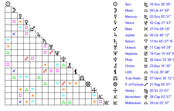 | Sun | 16 Scorpio 40 | 17 Scorpio 47 | 13 Pisces 15 |