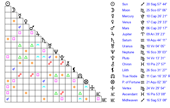 | Moon | 25 Scorpio 7 | 12 Libra 36 | 26 Aquarius 5 |