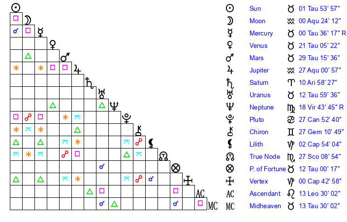 | Venus | 21 Taurus 5 | 26 Pisces 22 | 5 Virgo 9 |