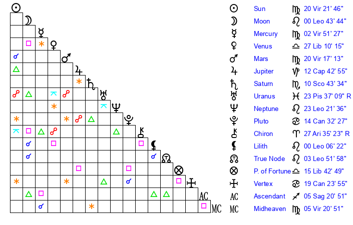 | Mercury | 2 Virgo 52 | 21 Virgo 23 | 11 Sagittarius 0 |
