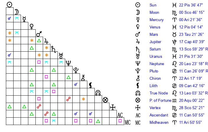 | Saturn | 14 Scorpio 33 | 22 Pisces 11 | 8 Scorpio 32 |