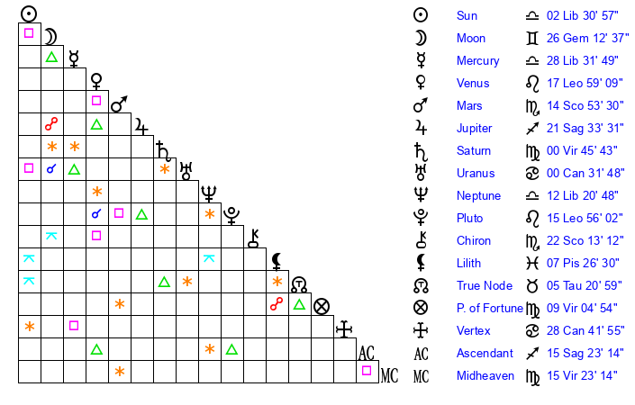 | Venus | 17 Leo 59 | 7 Virgo 34 | 19 Scorpio 20 |