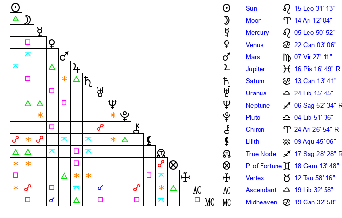 | Saturn | 13 Cancer 32 | 1 Aries 14 | 18 Cancer 14 |