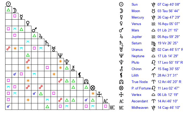 | Venus | 16 Aquarius 5 | 6 Capricorn 19 | 11 Aquarius 50 |
