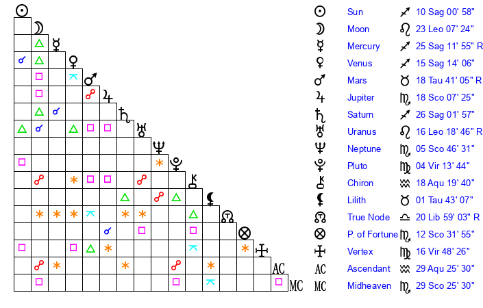 | Sun | 10 Sagittarius 1 | 10 Sagittarius 46 | 18 Aquarius 11 |
