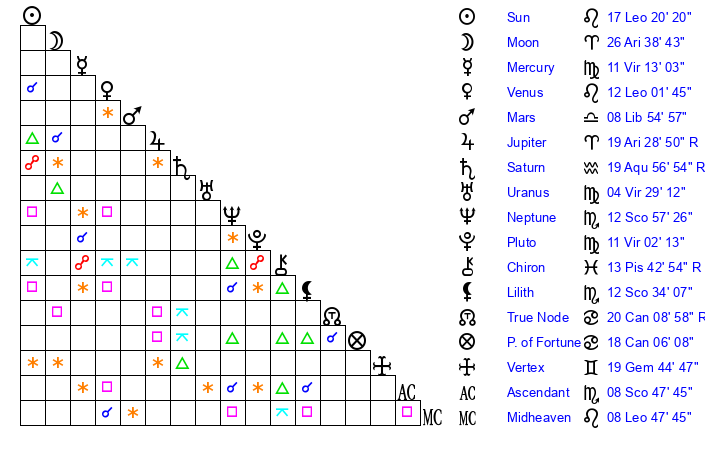 | Moon | 26 Aries 32 | 5 Pisces 50 | 10 Leo 54 |