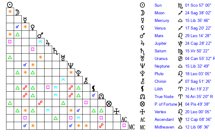 | Moon | 24 Sagittarius 37 | 18 Sagittarius 11 | 26 Virgo 21 |