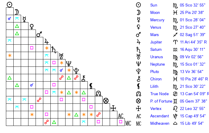 | Neptune | 15 Scorpio 1 | 29 Pisces 49 | 17 Scorpio 9 |